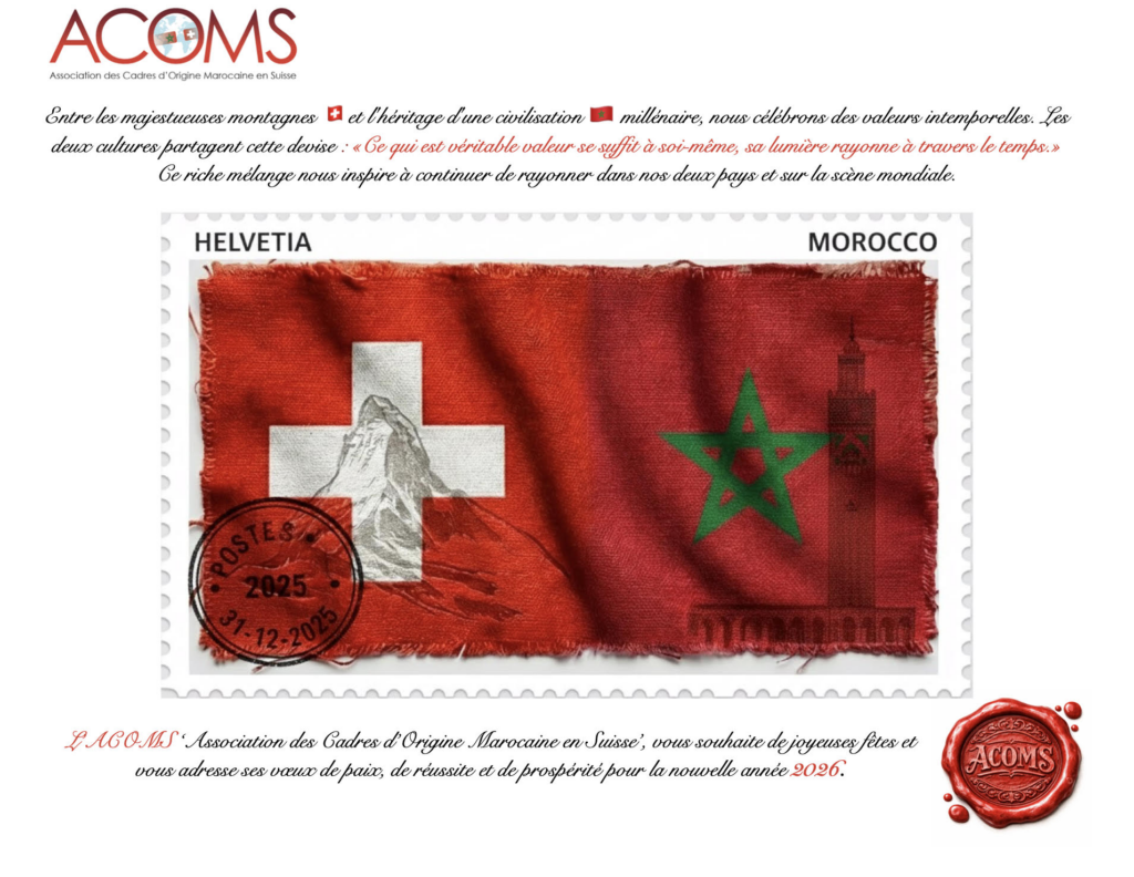 Alors que s’ouvre ce nouveau chapitre, l’Association de Coopération Maroc-Suisse (ACOMS) vous adresse ses vœux les plus sincères. Que 2026 soit pour chacun d’entre vous, sur les rives du Léman comme sur les terres de l’Atlas, une année de partage et de rayonnement.