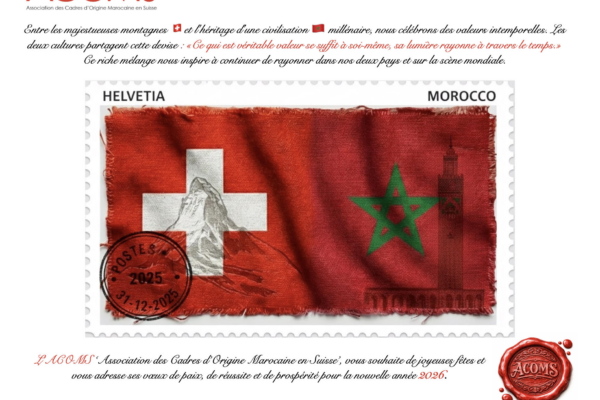 Chers membres, partenaires et amis de l’ACOMS, Alors que s’ouvre ce nouveau chapitre, l’Association de Coopération Maroc-Suisse (ACOMS) vous adresse ses vœux les plus sincères. Que 2026 soit pour chacun d’entre vous, sur les rives du Léman comme sur les terres de l’Atlas, une année de partage et de rayonnement....